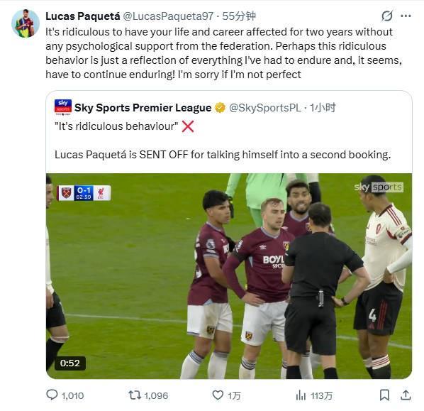 比赛结束后不久,帕奎塔在社交媒体上转发了自己染红的视频,并配文:“生活和事业受到影响长达两年,却得不到足协的任何心理支持,这实在是荒谬。”